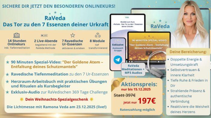 Erlebe zwei exklusive Live-Abende mit Ramona, in denen sie Dich praxisnah bei Deiner Heilreise begleitet und Dir tiefgreifende Einblicke in die RaVeda Methode gibt, inklusive einem kraftvollem “Herzens-Ritual zur Auflösung von Seelenverträgen von (alten) ungesunden Beziehungen. “